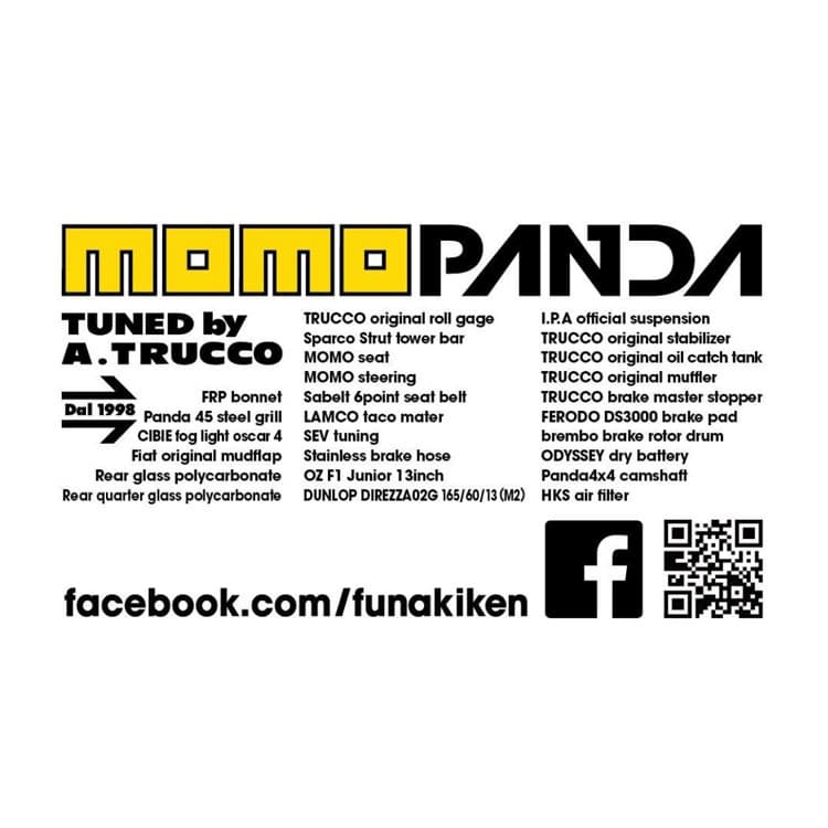 1998年からパンダカップにMOMOPANDAとして出場していました。当時のパンダカップカーの最後の貴重な現役カップカーです。 1000sieのインジェクションモデルをA112のキャプに変換して各所チューニングしていますが1000ccでミッションもノーマルです。 ド派手なライトポッドはいまだに配線していないためライトはつきません