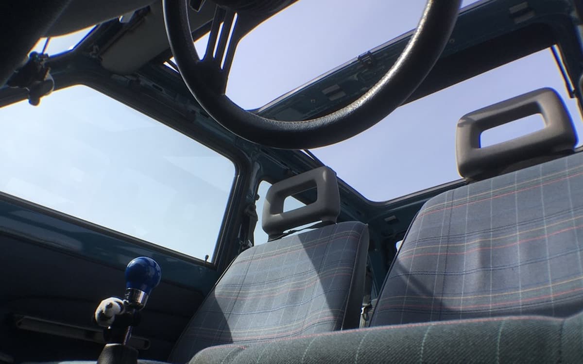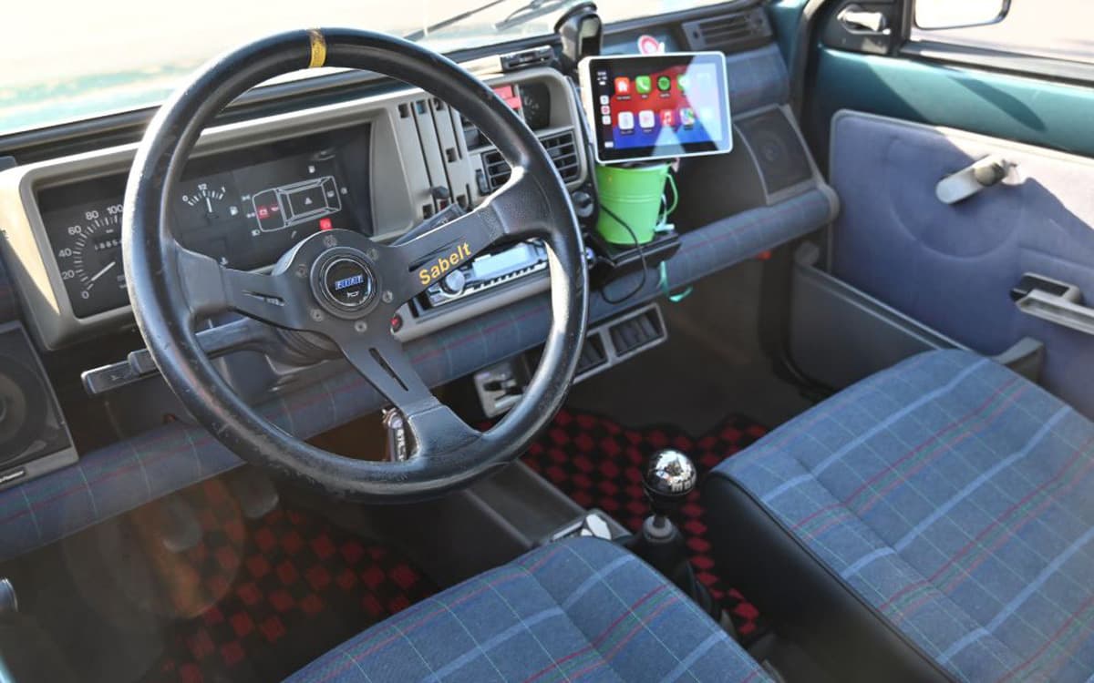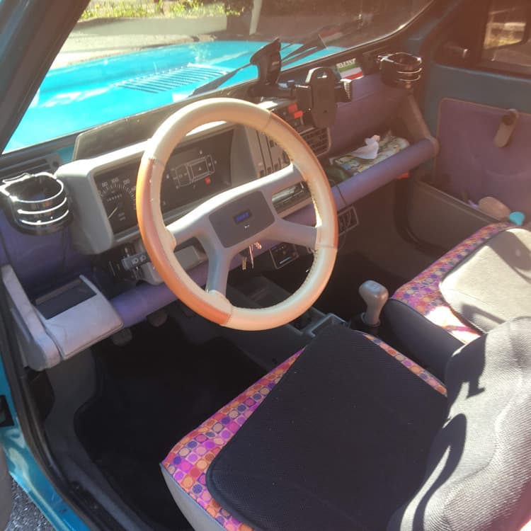 初年度登録1993年とセナがご存命自体の1000ccの4x4。ミッドナイトブルーを前オーナーさんが45の水色を目指して全塗装も失敗。。。という逸話付きの車両です。インジェクション車のためか、購入当初からエンストに黒煙、通勤途中にストップ→大事な会議に遅刻で大目玉を繰り返しました。。。(涙)あれやこれやと部品交換を繰り返すも改善されず、、会社からの信用も軍資金も底をつき、いよいよ切腹かという時にガレージレガルシィさんでキャブ化、見事な復活を果たし、今は毎日ギュイーンと楽しんでいます。黒のビニ革シート(破れてますが。。)に45グリル、珍しいと聞いたアバルトのマグホイールに2023年に旅立った愛犬ジルの歯型のついたリアシートが小さな自慢です。